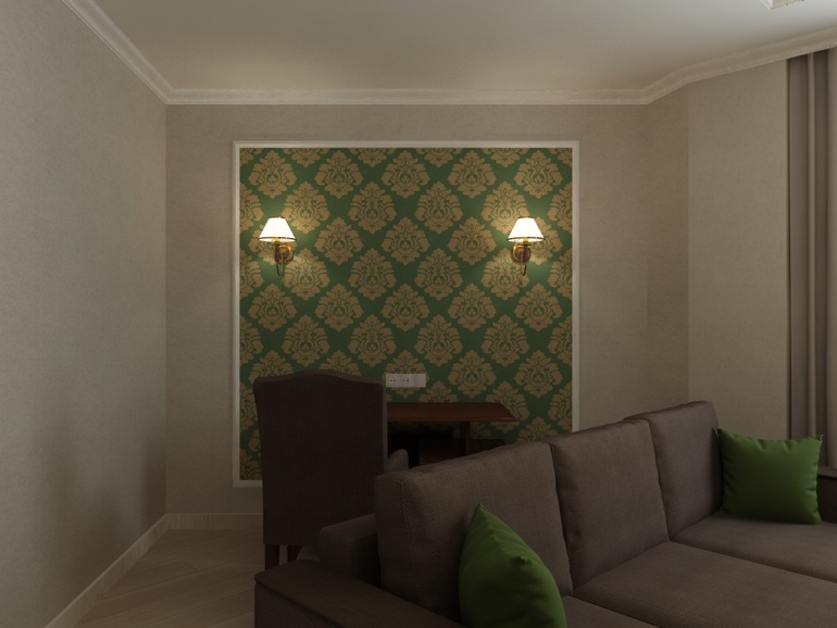 Мне кажется, серый цвет стены не очень сочетается с цветом мебели. Надо что-то теплое.