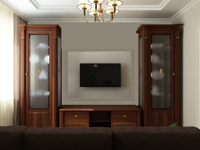 Интерьерное решение гостинойГостиная сложной формы, требований к оформлению было очень много, это должны была быть классика, без кричащих цветов, без мебели на заказ и без много чего еще))) Обязательно с рабочей зоной и прямым диваном.