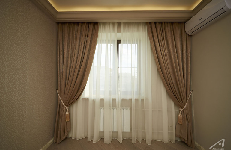 шторы тяжелые ,хорошо драпирующиеся никаких бандо не надо ,можно в цвет стен ,можно в цвет однотонных подушек и никаких стеклярусов и украшений на подхвате