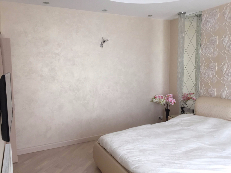 На данный момент ремонт в спальне у нас сделан, шторы тоже. На стенах штукатурка под мокрый шёлк ,оттенок тёплый кремовый с белым золотом, но штукатурка немного хамелионит, под разным освещением оттенки разные. Сейчас нам нужно выбрать покрывало на кровать, декоративные подушки и чехлы на подголовники на кровати.
