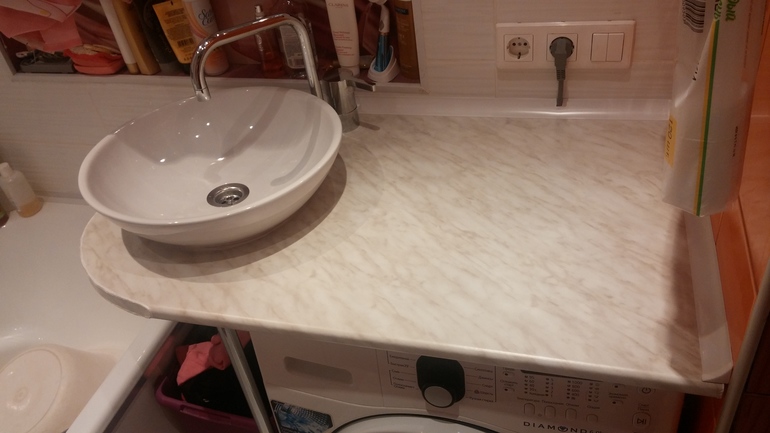 У меня на прошлой квартире была такая столешница. Купили самую дешевую, за 500 р в Максидоме. Пришлось ее упилить со всех сторон под наши размеры+ врезать раковину. Пилили лобзиком, затем края заклеили кромочной лентой с помощью утюга. Поверх прошлись герметиком на всякий случай. Там где врезали раковину - полностью замазали герметиком весь срез. За 3 года пользования на скругленном углу слез герметик, а повторно замазать руки не дошли. И вспух один угол, примыкающий к стене (возможно из-за конденсата, который стекал по плитке).