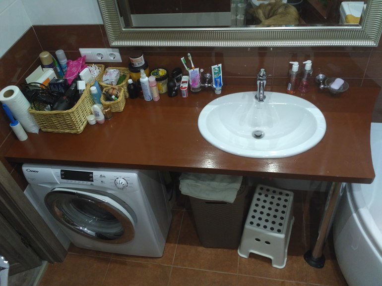 У нас не из ДСП, а из мебельного щита под маслом. Ещё видела на Вдолевке мебельный щит под яхтным лаком. У нас пока только полгода стоит, но никаких проблем нет. Выпил под раковину обработан маслом и герметиком. Простите за бардак, мы еще шкафчиком пока не разжились)))