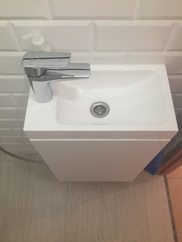 Нам очень хотелось умывальник в санузле, но меня напрягает вид коммуникаций поэтому взяли умывальничек с тумбочкой, в которой все и спряталось. Умывальник сделан из литого камня. Качество супер!!!