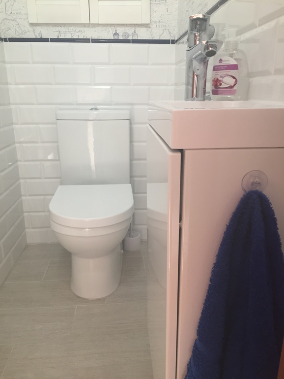 Я очень рада цвету пола, когда только купили плитку и разложили ее в ободранном помещении она была прям бежевой!!!! Жалею только, что в туалете не сделали теплый пол. Есть еще 2 недоделки - надо ручки прикрутить к дверцам и дозатор купить для мыла, но мне пока ни один не понравился.