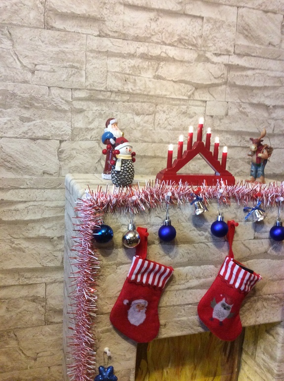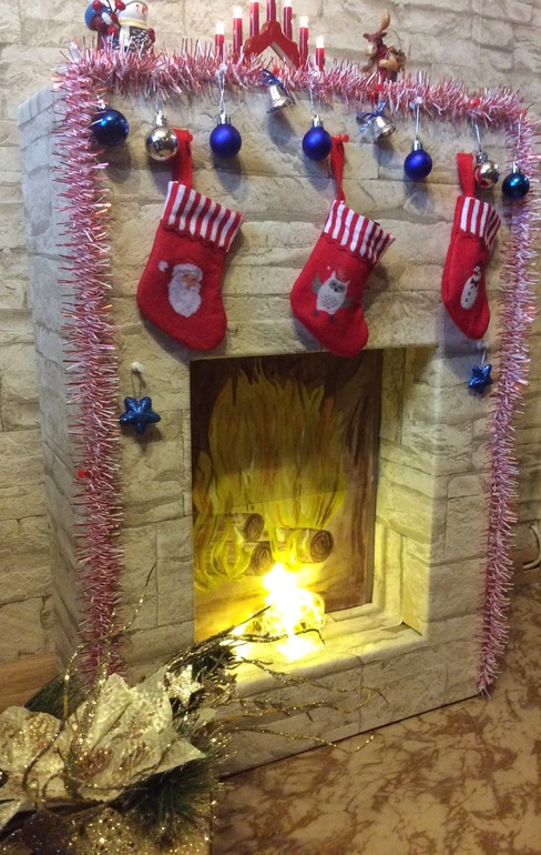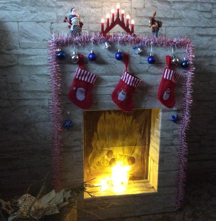 Интерьерные штучки.Вдохновила меня девушка под ником Хельга. Очень хотелось этот атрибут, но как- то глаза боялись, а коробка путалась под ногами уже целую неделю. И я взялась! У меня коробка из- под монитора, в неё вклелила коробку из под обуви и обклеила оставшимися обоями. Гирлянда- огонь на батарейках , новогодние мини игрушки , Дед Мороз и Снеговик из фикс прайса, носочки, Лосяш, подсвечник и подарок из Ашана. Вообщем, по магазину дольше ходить, чем делать такую приятность детям)
