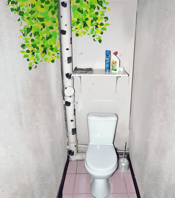 вот с бамбуком могло бы получится...трубы в бамбук одеть и плитка с этой тематикой. Видела недорогие коллекции подобной плитки в массмаркетах + шторку с листиками бамбука