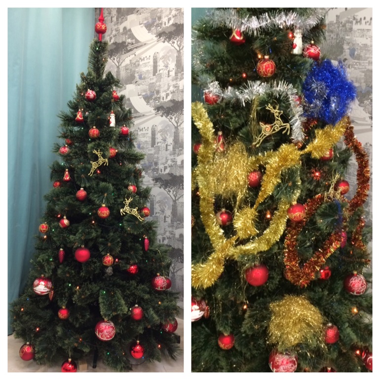 Я четыре года не наряжала, только на даче на улице огоньками -))). А а этом году решила поставить, шарики стекло. Наряжали с младшим, ни один шарик не пострадал. А сегодня приходил парикмахер и пока колдовал над моей головой вот что стало. Все что лежало под ёлкой оказалось на ней. В семье растёт дизайнер-)))