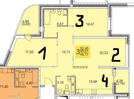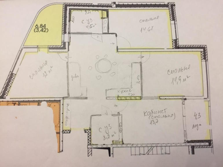 Сходили посмотрели, что делает сосед снизу, у них ремонт в полном разгаре. Натворили они конечно мрак - снесли кусок несущей стены, разделяющей комнаты 2 и 3 (примерно 80 см), пробили стену и сделали выход на балкон в том месте, где расположен большой санузел (сейчас там небольшое окно 60 см). Перенесли верхний санузел правее в сторону спальни. Лоджию одну присоединили, сделали там детскую комнату, а кухню сделали внутри без окна. Вот их схема: