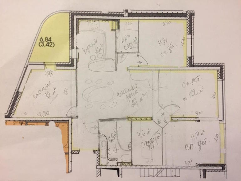 Конечно мы не собираемся трогать несущие стены, как сделали они. Но какие-то идеи почерпнули у них, у тоже хотели бы сдвинуть верхний санузел в сторону спальни 3, а на месте санузла сделать кухонную зону. Так вот реально ли узаконить перенос сан.узла, если под нами на 2 этаже тоже будет сан.узел (но будет ли он узаканивать свои перепланировки мы не в курсе, т.к. общались только с бригадой), на первом этаже нежилые помещения. В итоге хотим 4 спальни. На схеме пока только наши фантазии, ждем от дизайнера еще варианты.
