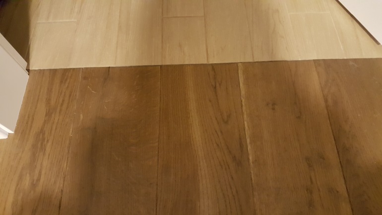 светлый пол- керамогранит, темный- массив дуба. Никаких порожков. Просто встык.