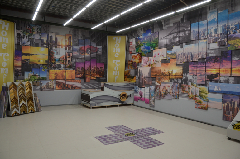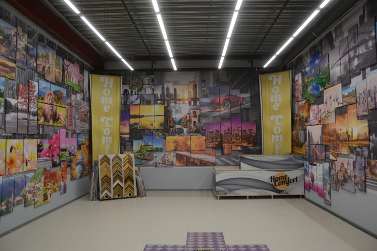Аляписто, картины теряются. Зря вы город напечатали, лучше уд однотон и перевешивать, как купят что-то... А в идеале вообще стелоажи отдельные, по тематике даже можно разбить было бы...