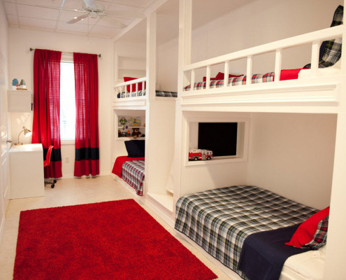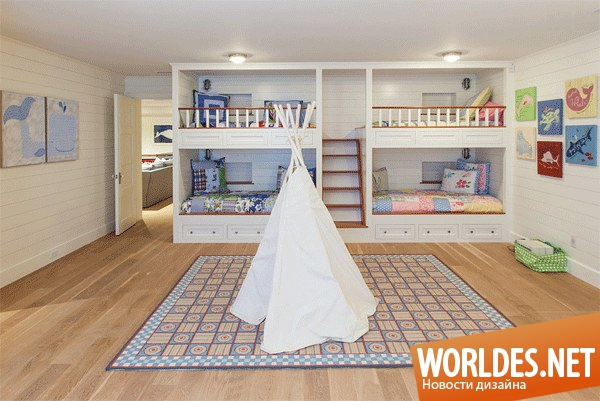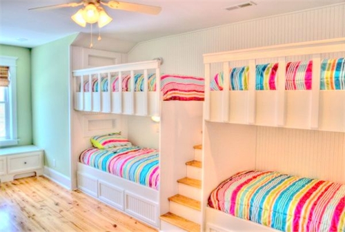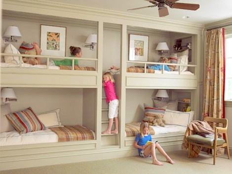 С год назад был пост мамы 4х девочек, она показывала их комнату с таким вариантом кроватей как на 3 фото. Хвалила функциональность и удобство.