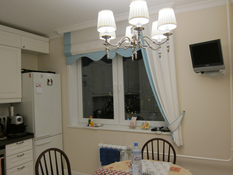 Кухня - повесили телевизор, люстру, шторы, также работа Елены Силаевой и закрыли боковину шкафа.