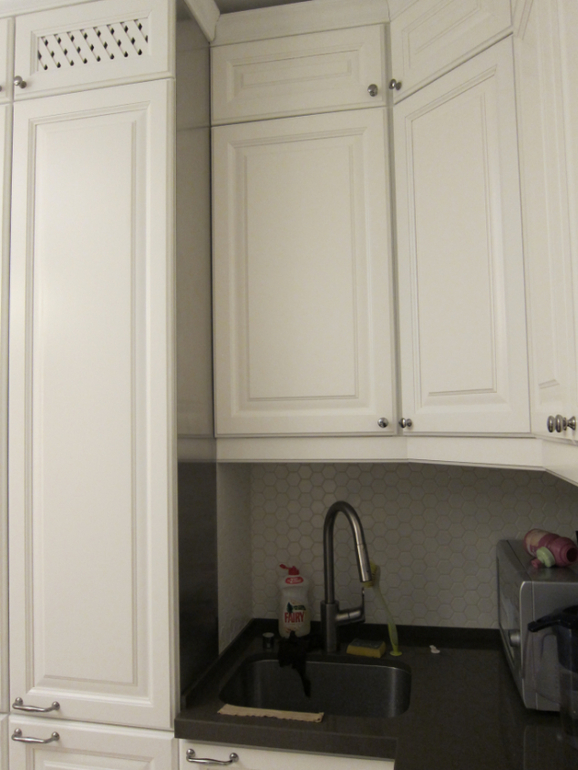 Было много вопросов об удобстве использования раковины в углу на кухне - все очень удобно, как и планировали закрыли боковую стенку шкафа около мойки листом нержавеющей стали - заказ аккуратно выполнил Вячеслав из http://www.art-l.net/ - очень советую.