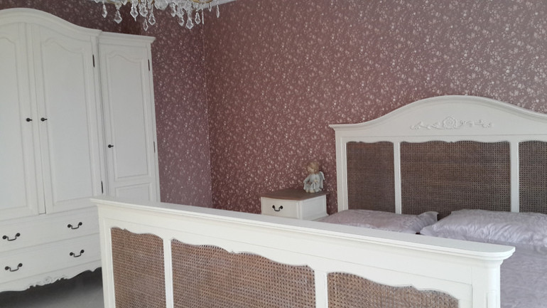 сейчас спальня выглядит вот так.. цвет стен-сухая лаванда.. и чуть розоватый цветочек.. ширина карниза будет 2,5м. но вот потолочный или кованый - пока еще не придумала.. будет зависеть от выбора гардины