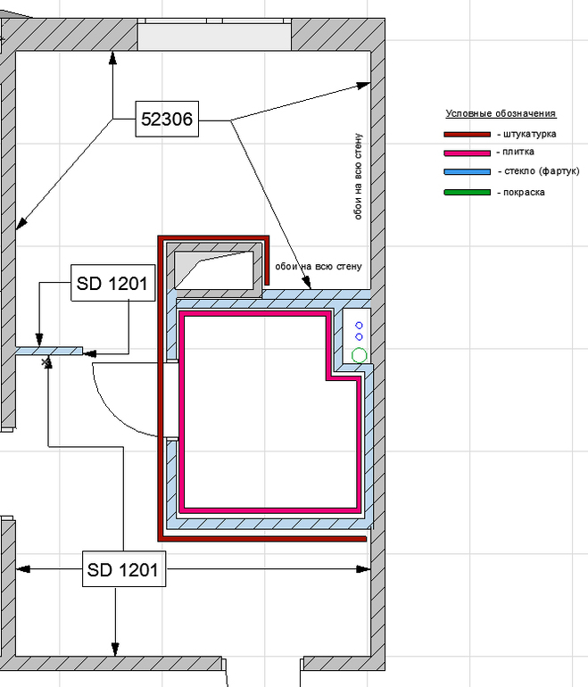 4. Вы получаете планы для строителей с указанием где что клеить и как раскладывать. Где какие светильники повесить и т.д. (Для примера план с указанием расположения выбранных обоев).