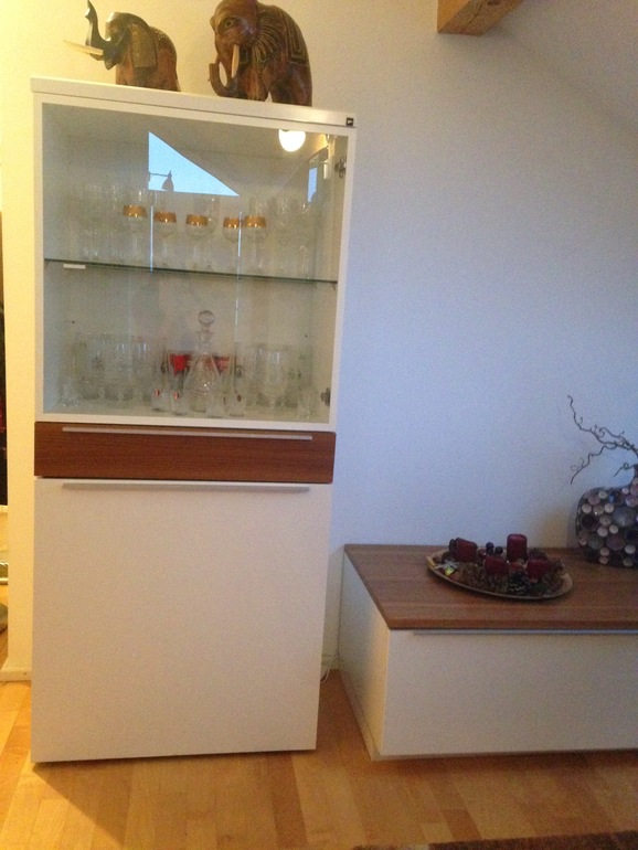 У нас вот такой шкаф-буфет стоит для посуды. Сверху стаканы-фужеры-рюмки. Снизу удобно, что закрытые ящики и можно " прятать" посуду . У меня снизу лежат скатерти, салфетки, подсвечники и декорации всякие.