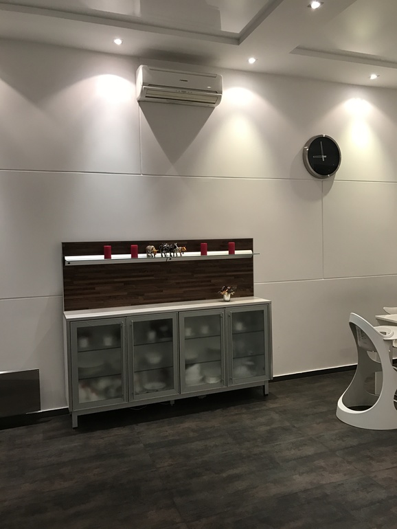 какая красотаааа. Стульчик клевый ))) А это вот у тебя полуматовое считается стекло? Я вот и подумала что на нижние нужно глухие дверцы, потому что там как раз стулья будут, чтоб не разбили. Блиииин. Как же красивоооооооооооооо, не могу )))) я хочу тарелки/кружки в верхней части, а вниз всякие там блюда скинуть, которые раз в пятилетку достаются. Слушай, а на стенах это у вас деревянные панели? интересно так смотрится )