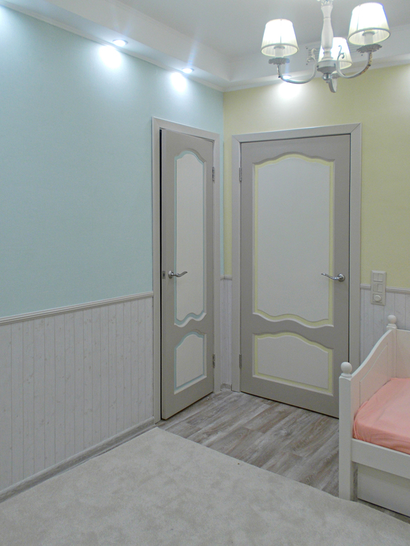 краскопультом не стала, побоялась испачкать все вокруг)) мелкие филенки кисточкой красила (вообще художественной), а основное малярным валиком (плотным, без ворсинок), ну и по углам кистью.