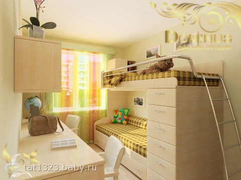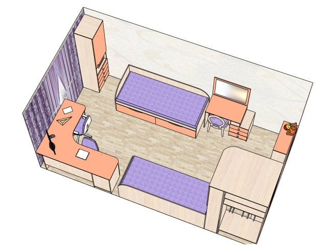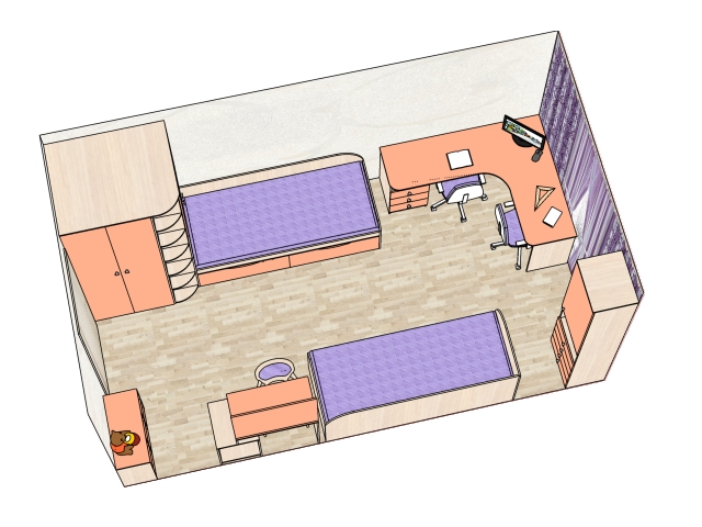 ) две полноценные кровати 0,8х1,9, два полноценных рабочих места, шкаф, туалетный столик и стелаж для игрушек