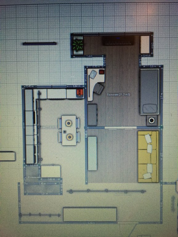прихожая где 1.08 метраж стоит, от гстиной прихожую отделяет сквозной стеллаж. В гостиной получилось у нас диван с круглым столиком, потом синтезатор которого нет пока) потом дверь в спальню, камин, над ним - тв, дальше торшер и кресло. А по правой стене после шкафа-купе низкий стеллаж для книг.