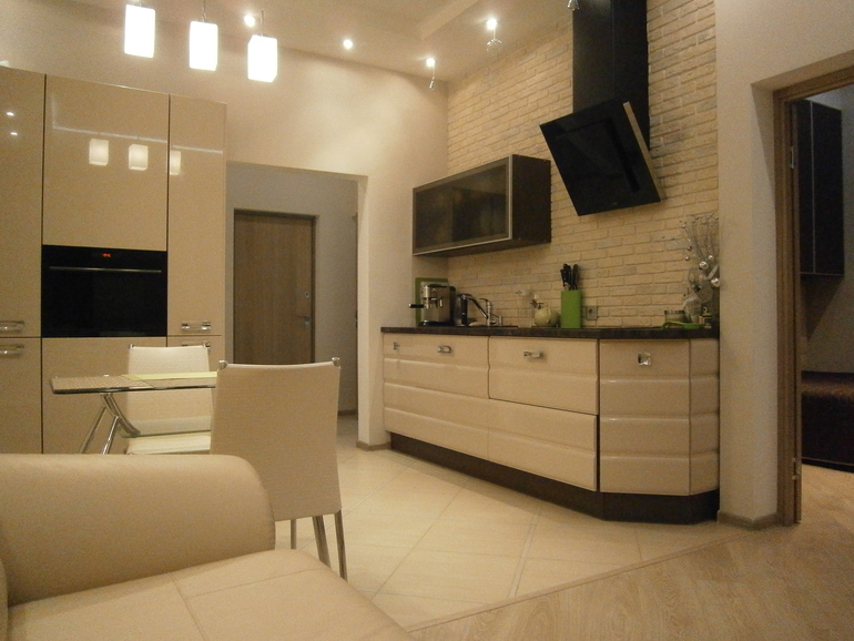 Первая шикарная, а сами будем делать низ кофе с молоком, верх белый, фартук плитка кирпич светлый.