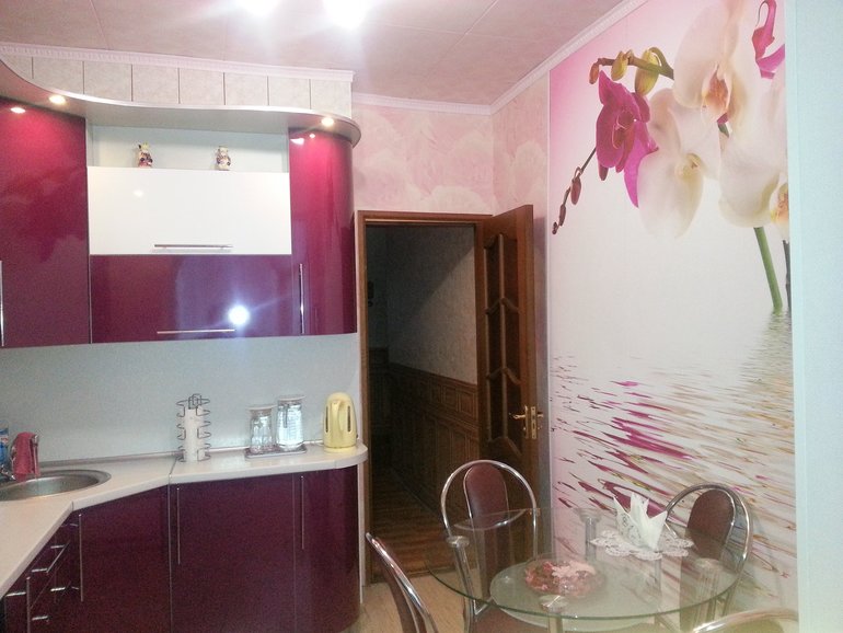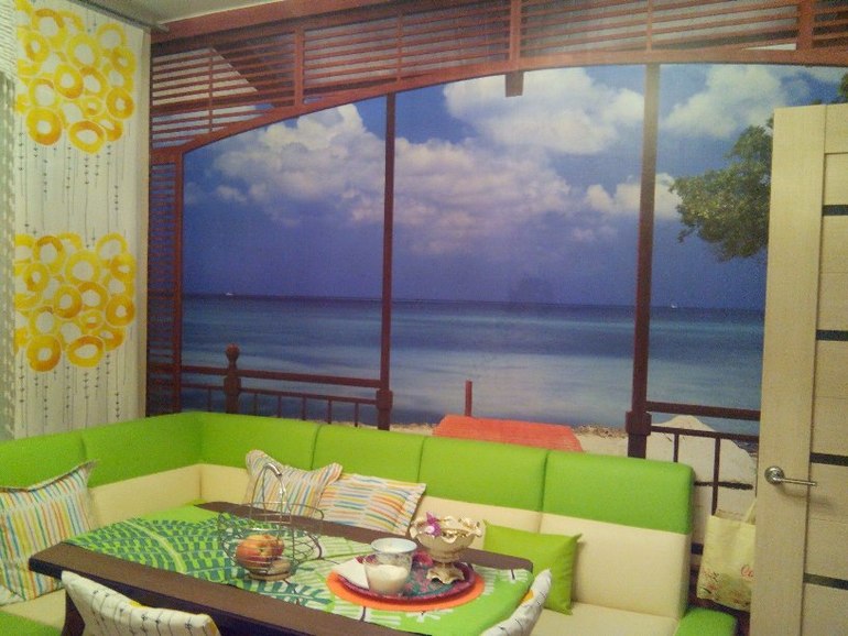 Наклеили на одну стену тоже фотообои - мне лично результат не понравился. Кухня у нас квадратная, 12 кв.м, и вот с этими фотообоями кажется что одной стены нет, как-будто комната какая-то не цельная. Купили недавно рулон обоев - будем переклеивать. И на этой стене сделаем галерею фотопанно нашей семьи)) Т.к. у нас и кухня и гостинная в одном))
