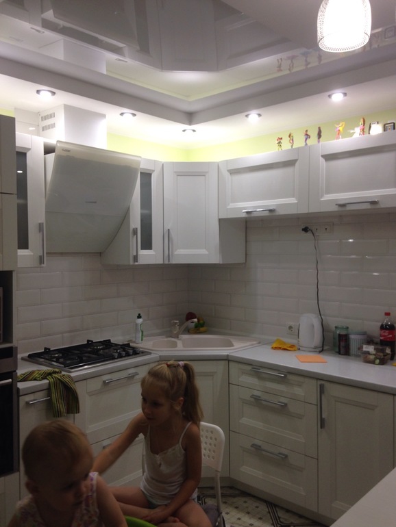 Говорит у тебя вся кухня будет белая, хотя кроме нижних шкафов и фартука больше белого не будет, техника и то вся серебристая.