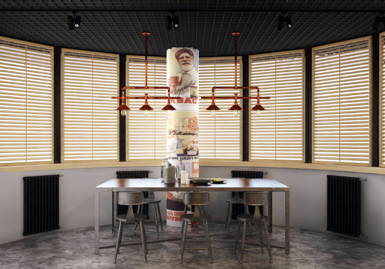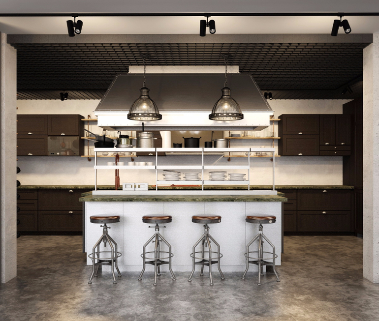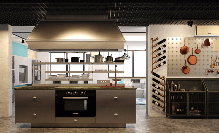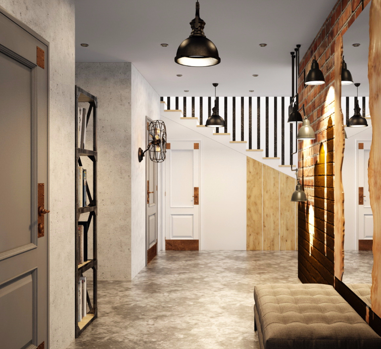 Техническое задание для первого уровня: как можно меньше мебели, больше простора. Большая и функциональная рабочая поверхность кухни. Отделка в стиле лофт и индастриал. Контрастность отделки. Наличие кабинета.