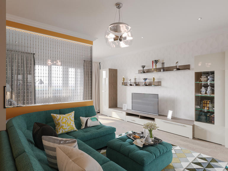 Отлично! По цветам гостиная-спальня на визуалках конечно интереснее. Этот сочный бирюзовый в сочетании с горчичным - прям огонь! Но обивка, как я понимаю, подбиралась под панно за кроватью, а у него видимо цвет вживую оказался похолоднее и не таким насыщенным.