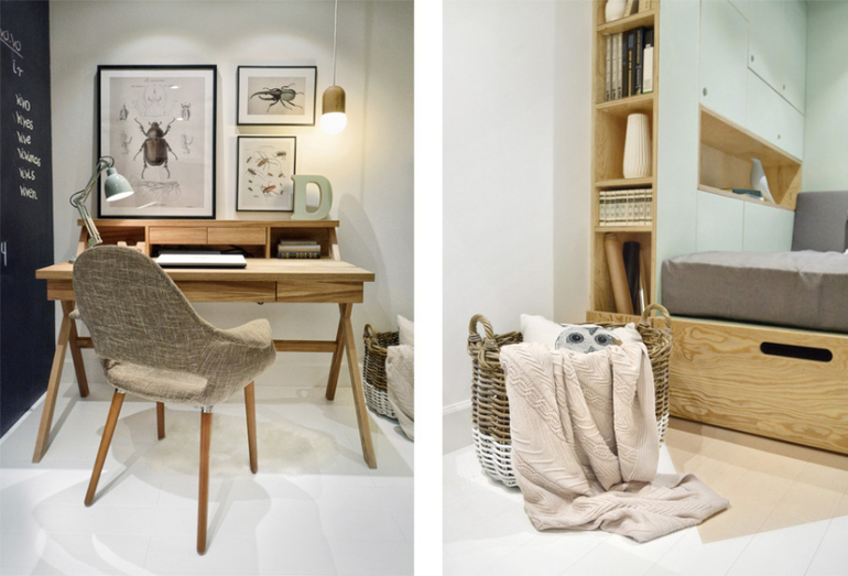 В данном примере комната разделена на спальную и рабочую зоны. Но так же можно поступить со спальней-гостиной или маленькой детской.