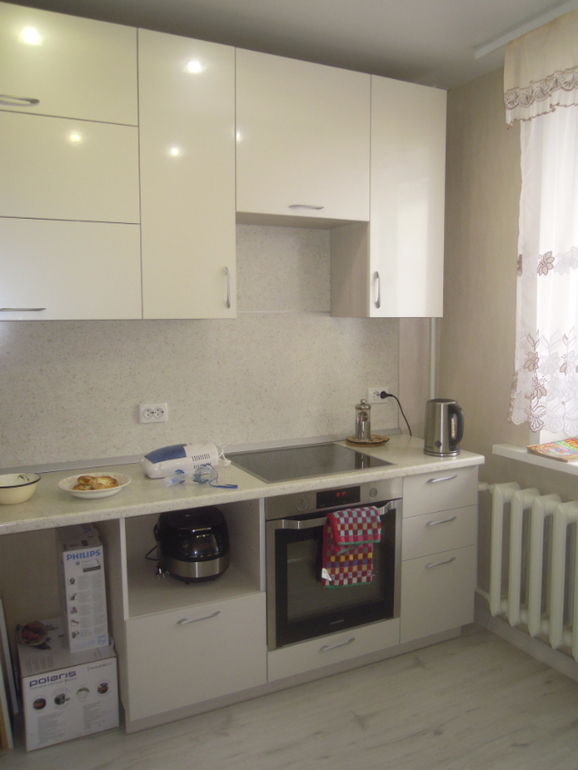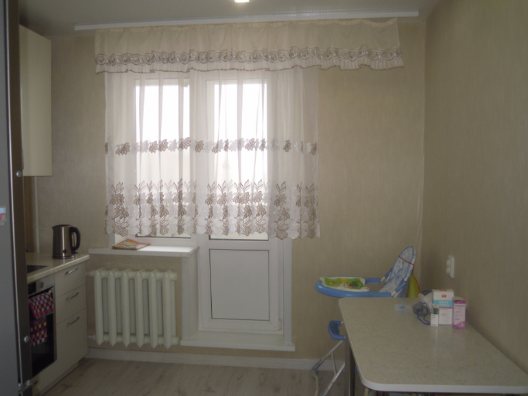 Девочки, обладательницы кухонь с выходом на балкон, подскажите, а еще лучше покажите какие шторы лучше повесить, чтобы можно было и свободно выйти на балкон и не мешалось слевой стороны, где кухонный гарнитур (при открытии шкафчиков длинные шторы там застревают). Проблема еще и в карнизе, он сделан не до конца стены и поэтому задвинуть штору не получится. В итоге с одной стороны штора должна быть длинная, а с другой короткая. Но вот как это реализовать не знаю. Фото кухни под катом. Прошу прощения за беспорядок. Нитяные не хочу, маленький ребенок теребит их.