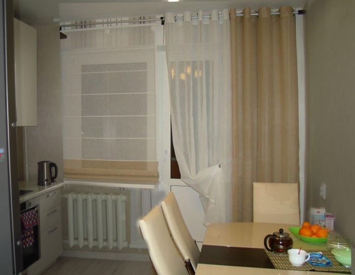 Никакие. Всегда было загадкой, зачем вешать тряпки на окна в помещении, где готовишь, да еще и на балконную дверь. У меня выход на лоджию из кухни, штор нет.