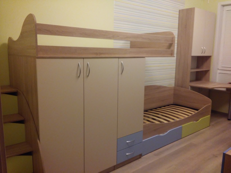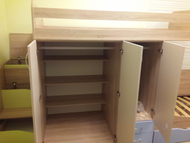 Детская фирмы Наша Марка серия МАКС (самая классная мебель во всей квартире, качественная и бюджетная).В лестинице два ящика нижние выкатные, у двух верхних открывается крышка вверх. За штангой в узком шкафу полки.