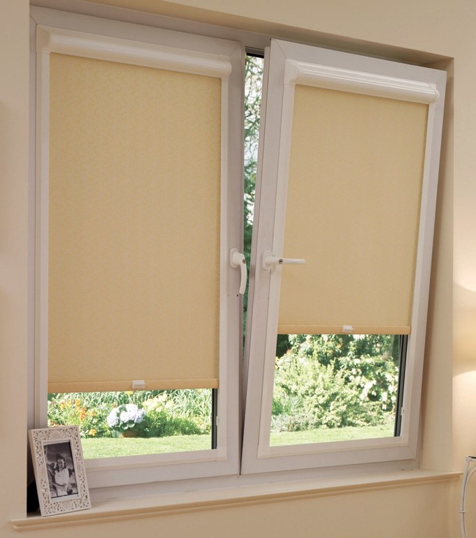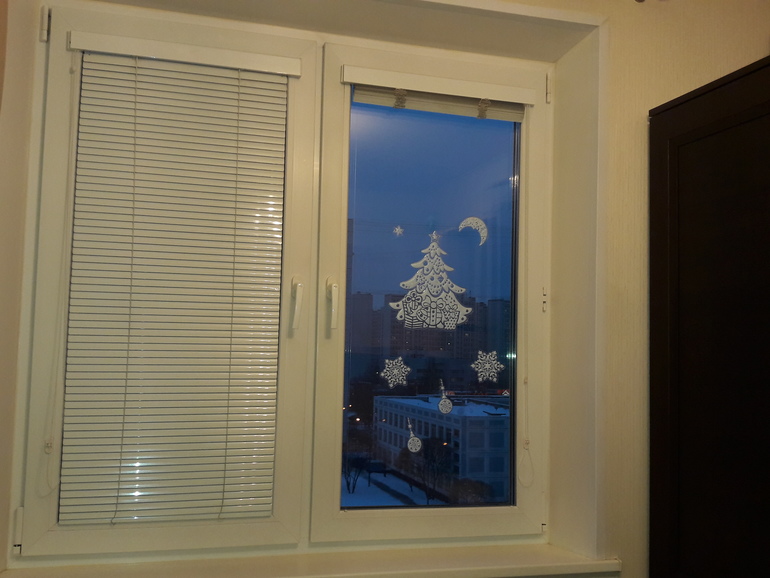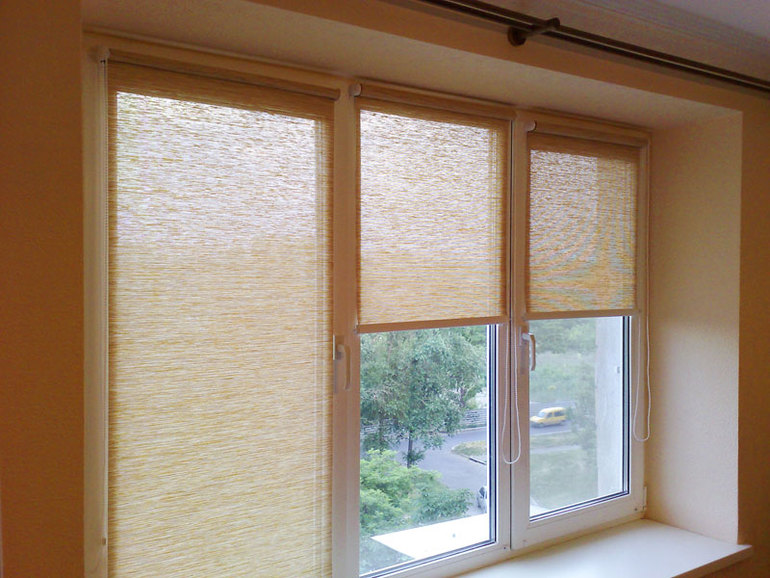 У нас просто рулоная штора висит внутри окна, тоже ничего.