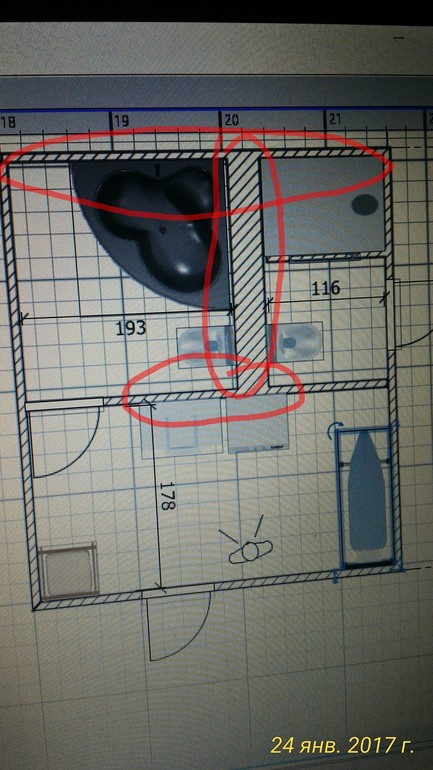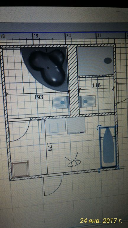 Ну да как то чтоб все трубы были как то на одной стене. Двери...одни в комнату где душ+туалет, другие в комнату с раковиной и стиральной из нее в комнату с ванной и туалетом