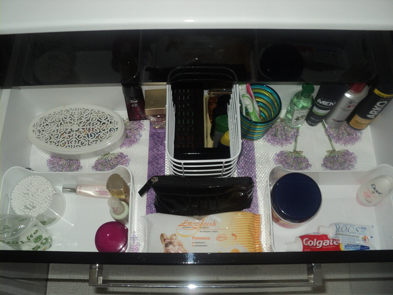на раковине только жидкое мыло а все остальное в ящике комода-очень удобно