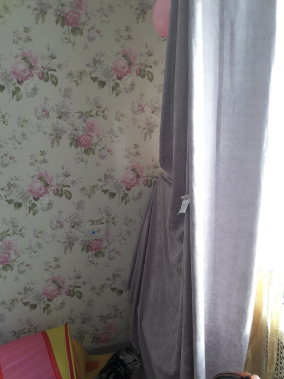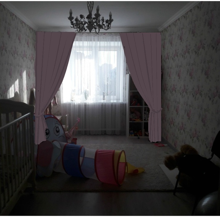Может быть убрать слеллаж от окна и поставитьего вдоль стенв на бок( там сейчас черный стул)? Появится дополнитяльная площадь для игр. Если ребенок не левша, то стол тоже нужно переместить к противоположной стене. Шторы однотонные в цвет роз, или в цвет зелени. Можно сделать небольшие детали с зеленым, например подхваты.