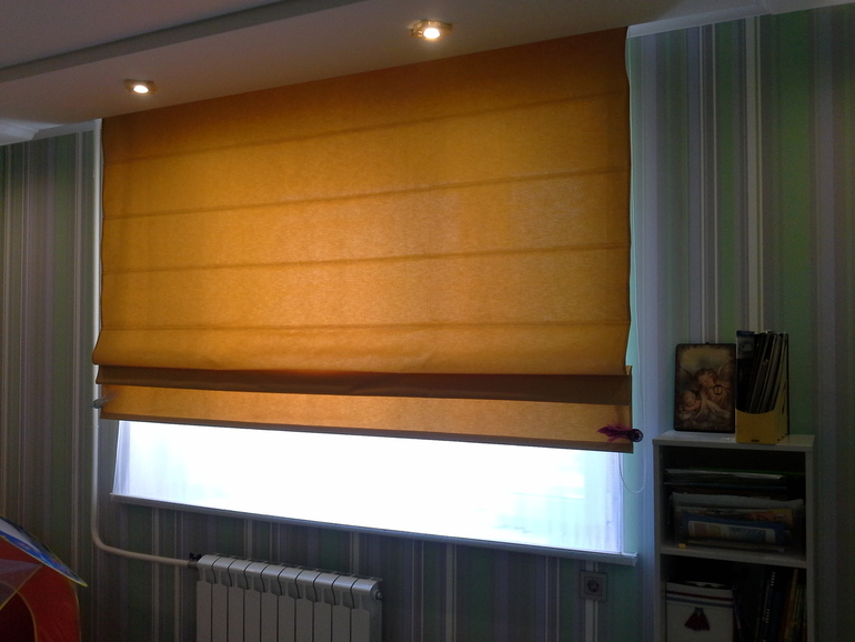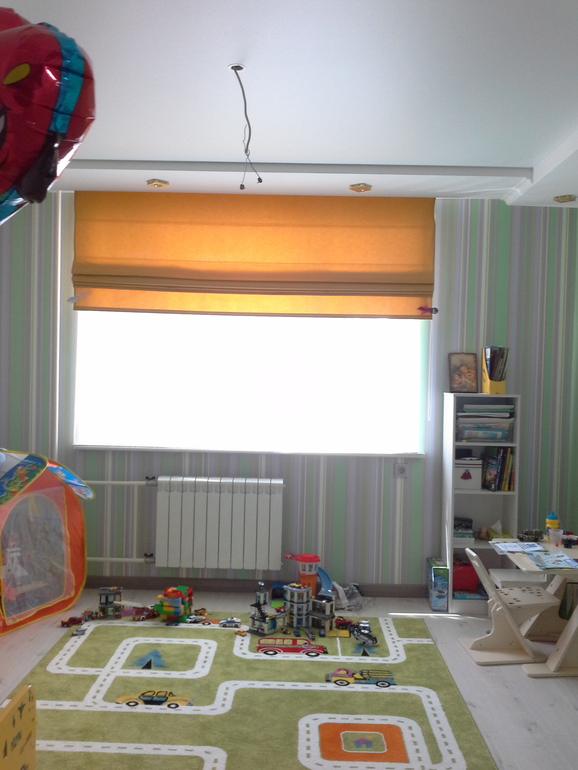 Поднимаю старый пост, может кто-то помнит, я не знала как оформить окно в детской. Окно оформили, и переехали, с нами переехали наши старые вещи, кровать, комод, парта, и куча игрушек:) Я в восторге от двойной римской, которую мне делала Аня, с Бб.Теперь не переживаю, что вечером любопытные соседи будут подсматривать:)Первая, очень тонкая, как тюль, легкая, как раз для дня, вторая более плотная, желтенькая. Люстрю пока нет, точнее, на нее нет денег:)