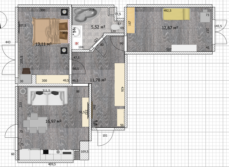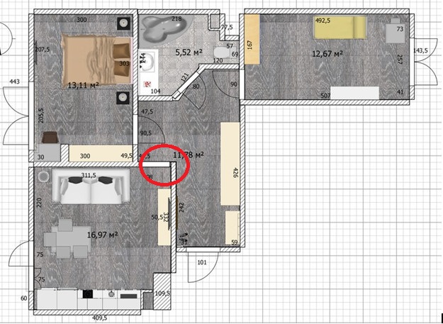 Ксения, добрый день! Я тоже подозреваю, что планировка не в масштабе)). Но вопрос у меня такой: не хотите дверь в спальне передвинуть ближе к санузлу? 49,5 - такой глубины маловато для шкафа даже с распашными дверями. И угловой выступ там, где проем, в гостиной можно убрать. Рекомендую Вам все-таки сделать планировку в масштабе. У Вас написано 121 размер стены с проемом в су, а по построению выходи только 100 см.