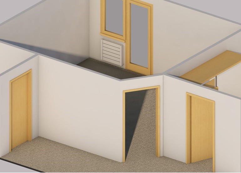 Угол, где вход, если его убрать, ничего не изменится, а коридор не будет угол "вытарчивать"