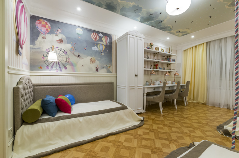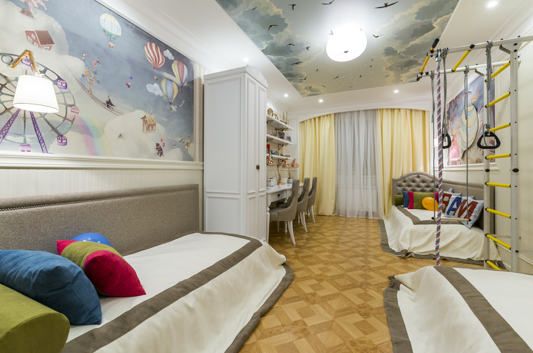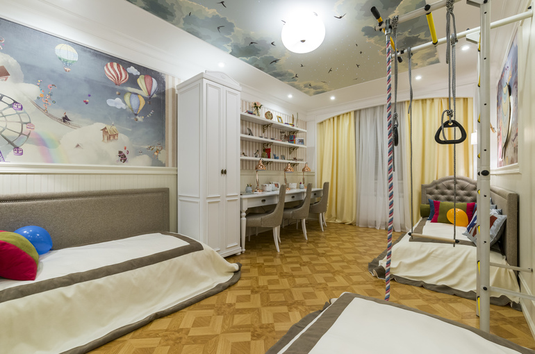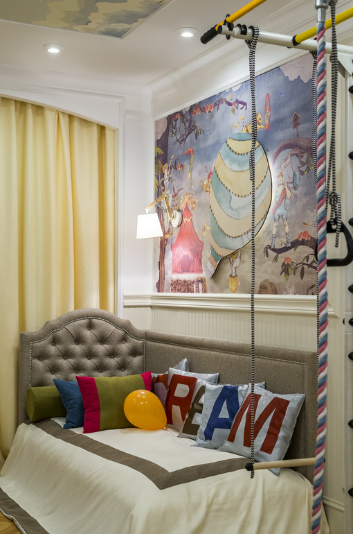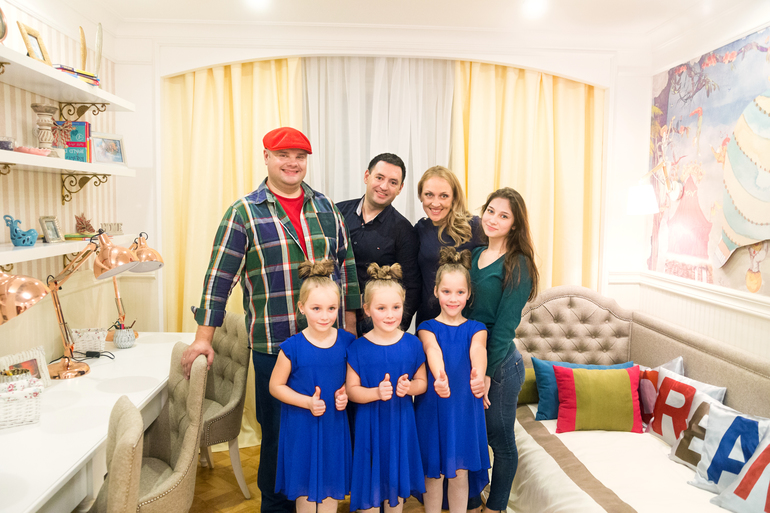 Интерьерное решение детской комнатыДо сих пор в 19-метровой детской стояли три письменных стола, диван, шкаф, и ни малейшего намека на стиль или хоть какой-нибудь дизайн. В комнате жили шестилетние тройняшки: Лера, Саша и Вика Зубковы - будущие звезды цирка, между прочим. За переделку комнаты взялась "Школа Ремонта" на ТНТ и дизайнер Иван Урека, который за идею интерьера взял цирковые образы. Дизайнер внимательно посмотрел рисунки девочек и решил: все нарисованное должно здесь быть, а рисовали они акробаток и клоунов, жонглеров и дрессировщиков.