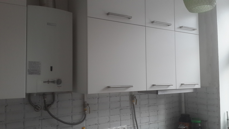 Недавно ремонт делали, газовую колонку сместили немного, что бы шкаф побольше влез, трубы от воды частично убрали в стену. Верхние шкафы подняли (кухню купили из икеи, у нее нижние шкафы немного выше, чем обычно у кухонь), по-этому при том что они висят в 60см от столешницы, все краны получились ниже них. В шкафах сделали выпилы под трубы. Недавно приходили из мосгаза, никаких претензий к колонке не было))