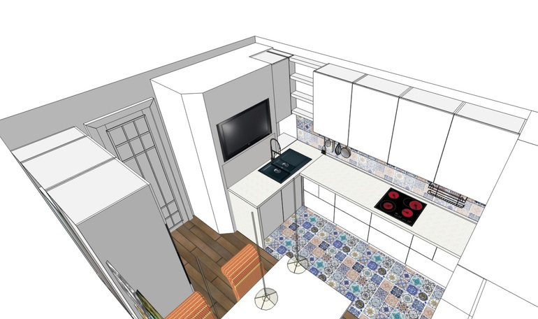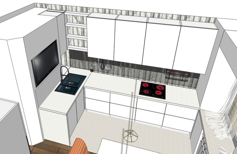 4. Мойку развернуть на другую стену - будет слишком маленькая рабочая зона между раковиной и варкой. Хотя, с другой стороны, большая зона появляется слева под ТВ.
