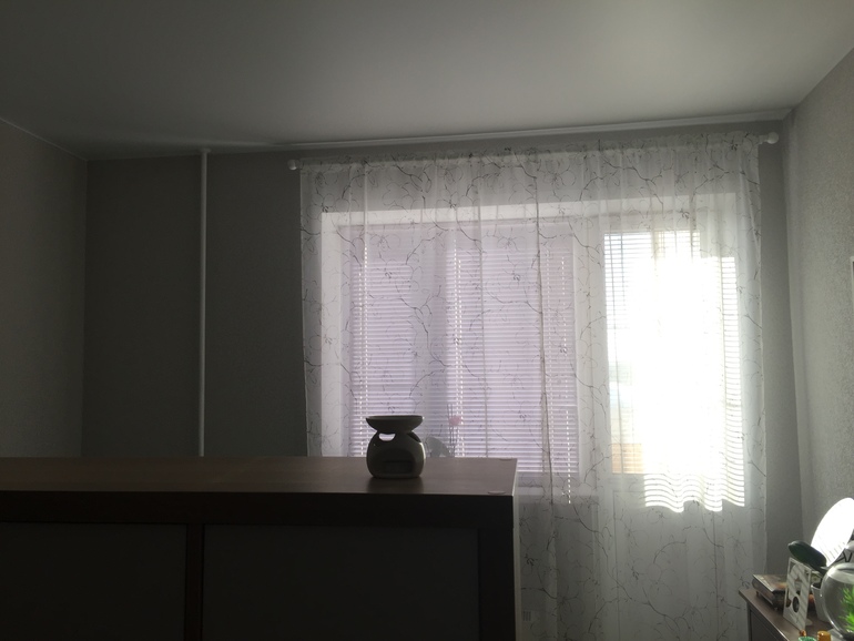 У нас тоже стояк сбоку и вдобавок стена четыре метра. Сделали потолочный карниз от стены до стены, шторы с ламбрекеном. Без него как заплатка эти шторы))