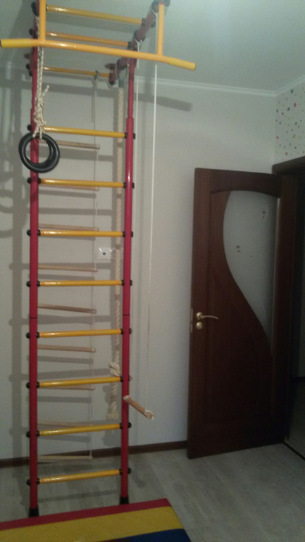 Какие у вас обои симпатичные :) И спортивный уголок к ним замечательно подходит, и смотрится достаточно необычно - мне сине-желтые в основном попадаются.