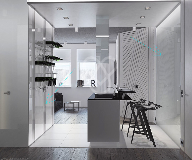Из решений, которые могли бы сделать комнату без окон уютнее нам понравилась идея стеклоблочных полос (увидела идею на этой картинке), дверь в спальню так же будет со стеклом