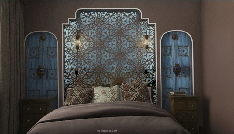 Жаль такое красивое панно закрывать спинкой кровати. Может быть сделать кровать без спинки, а под подушки, к стене положить валик с кистями на всю ширину кровати? Будет вполне в духе и панно видно))