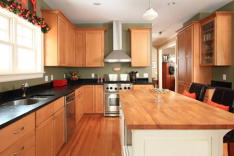 Вот нравится оливковая стена, правда беж не совсем ваш, но зато столешница темная и сочетание видно,что красивое!