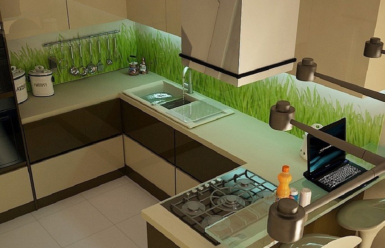 Если на противоположной стене город в ночи, то на фартук, думаю, подойдет плитка крупноформатная, без рисунка-трава сюда ну никак. Или же траву, а напротив однотонные фактурные обои. Не поняла про столешницу. Она из мозаики или ЛДСП ламинированная и цветом как мозаика бежево-коричневая?